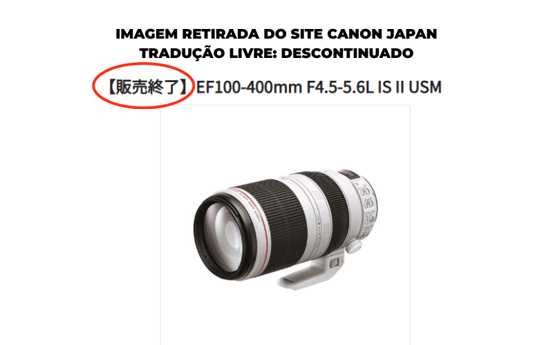 A Canon do Japão passou a exibir oficialmente o status de descontinuada para a lente EF 100-400mm f/4.5-5.6 L IS II USM em sua loja virtual. Com essa mudança, a linha de telezooms EF disponíveis na loja japonesa fica reduzida a apenas um modelo: a EF 70-200mm f/2.8 L IS III USM. Alguns revendedores da região também já atualizaram o status do produto em seus estoques.